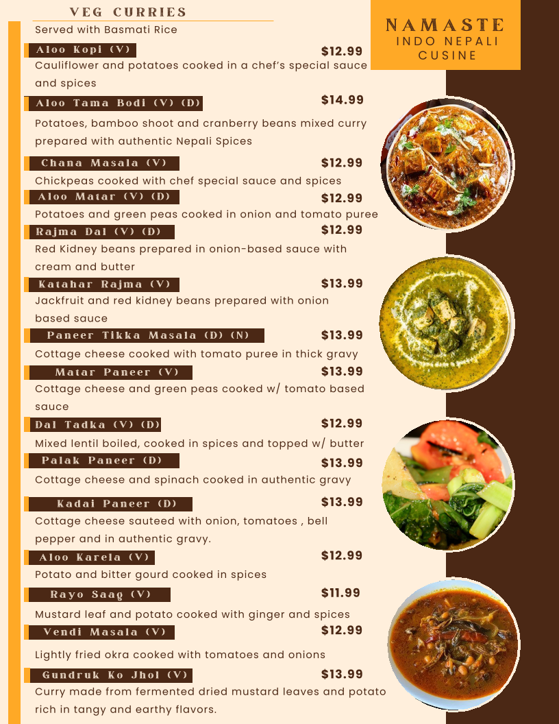 Potatoes, bamboo shoot and cranberry beans mixed curry prepared with authentic Nepali Spices. Served with Basmati rice
